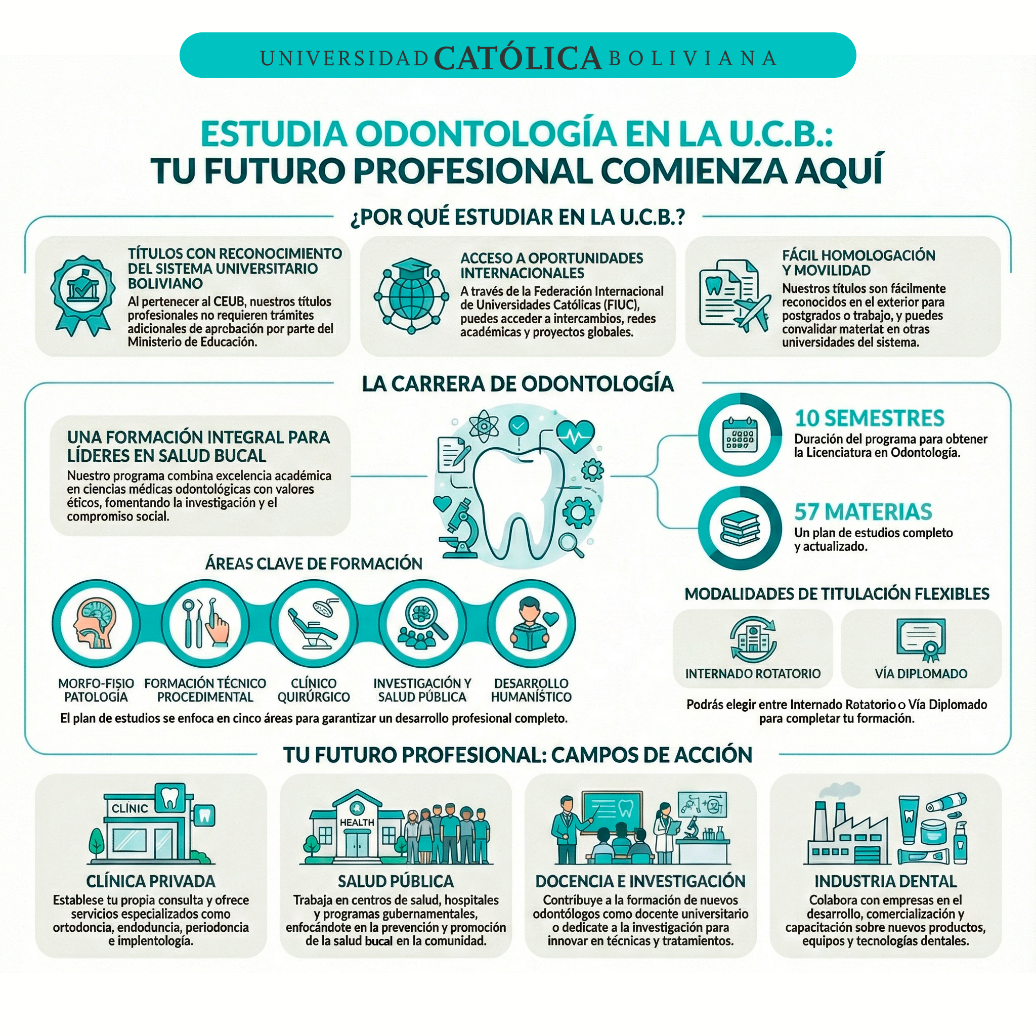 Como profesional de la Universidad Católica Boliviana, además de aplicar técnicas de intervención clínica, realizarás investigación utilizando instrumentos diagnósticos y tecnología de vanguardia que permiten la valoración del estado de salud bucodental, para la prevención y tratamiento de patologías orales, identificando los problemas y necesidades de atención odontológica y rehabilitación.