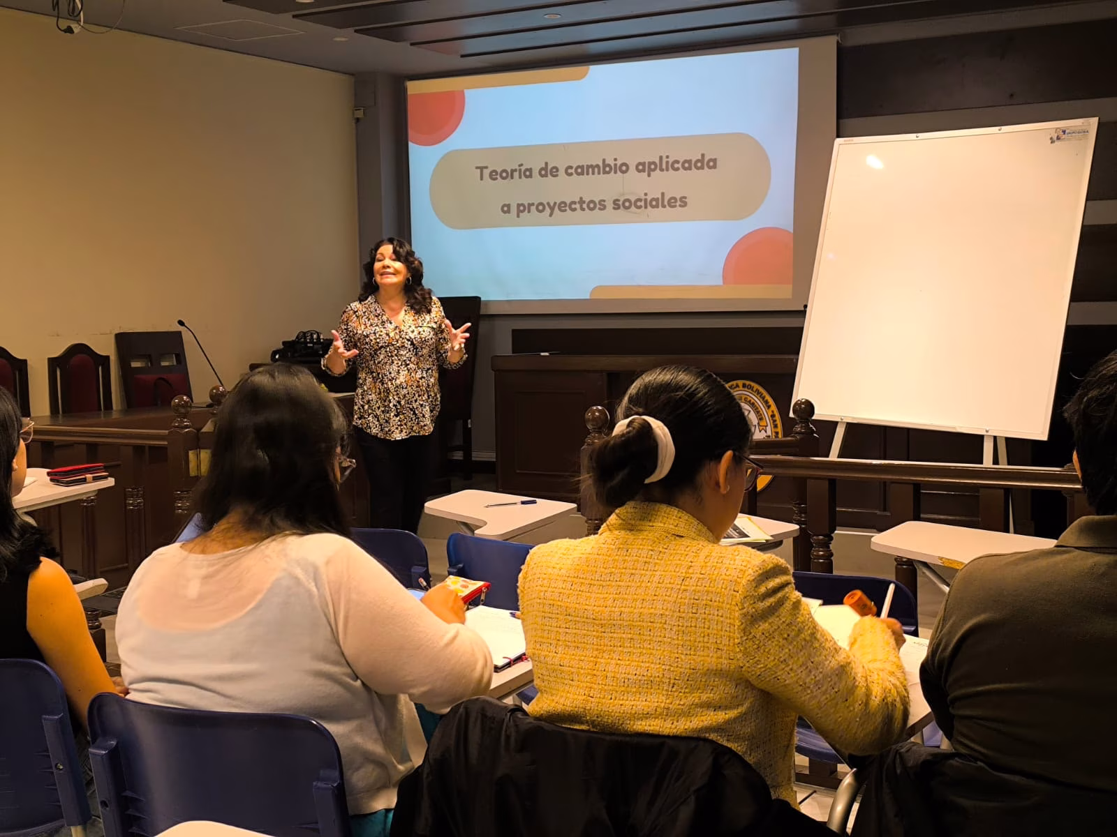 El SubProyecto 1 del Programa VLIR UOS UCB y la Sociedad Científica de Estudiantes de Psicología realizaron con éxito el Taller sobre la «Teoria del Cambio aplicada a Proyectos Sociales» a cargo de la Mgr. Teresa Avila, ingeniera agrónoma, con Master en Ciencias de la Universidad de Gembloux en Belgica y doctorante del Doctorado en Comunicacion e Información de la UCB, quien con su amplia experiencia en investigación y planificación para el desarrollo en temas de biotecnología, genética, divulgación científica y proyectos, guio a los asistentes desde la presentación de la Teoria del Cambio, su monitoreo, evaluación y el diseño de indicadores y medios de verificación gracias a Casos Hipotéticos.